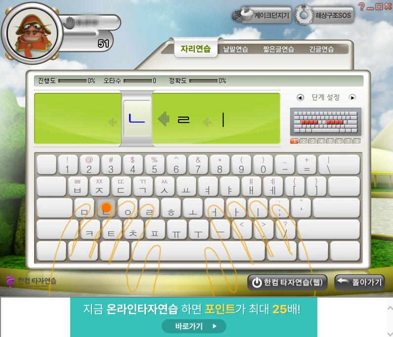 키보드 위에 손가락 놓는 방법을 알려주었더니, 손가락의 이미지와 누르는 키의 주황색 동그라미 점이