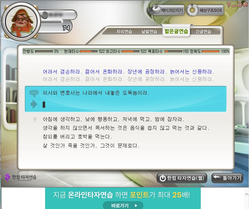 의문을 품으며 웹에서 검색해보았다. 한컴타자사이트 발견하였고, 별도의 회원가입 절차 없이 이용이 가능하였다.